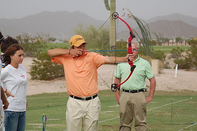 coaching for each of the golfers trying archery. The golfers who
